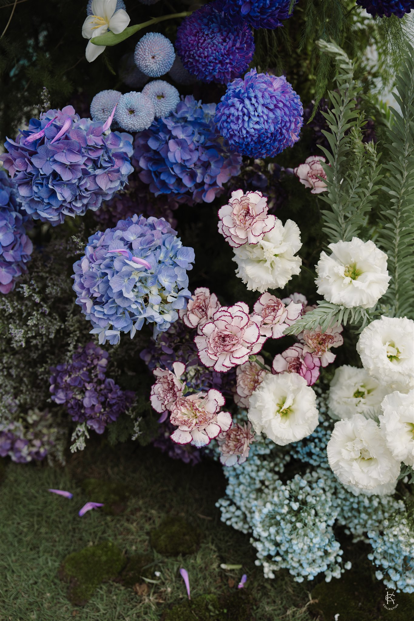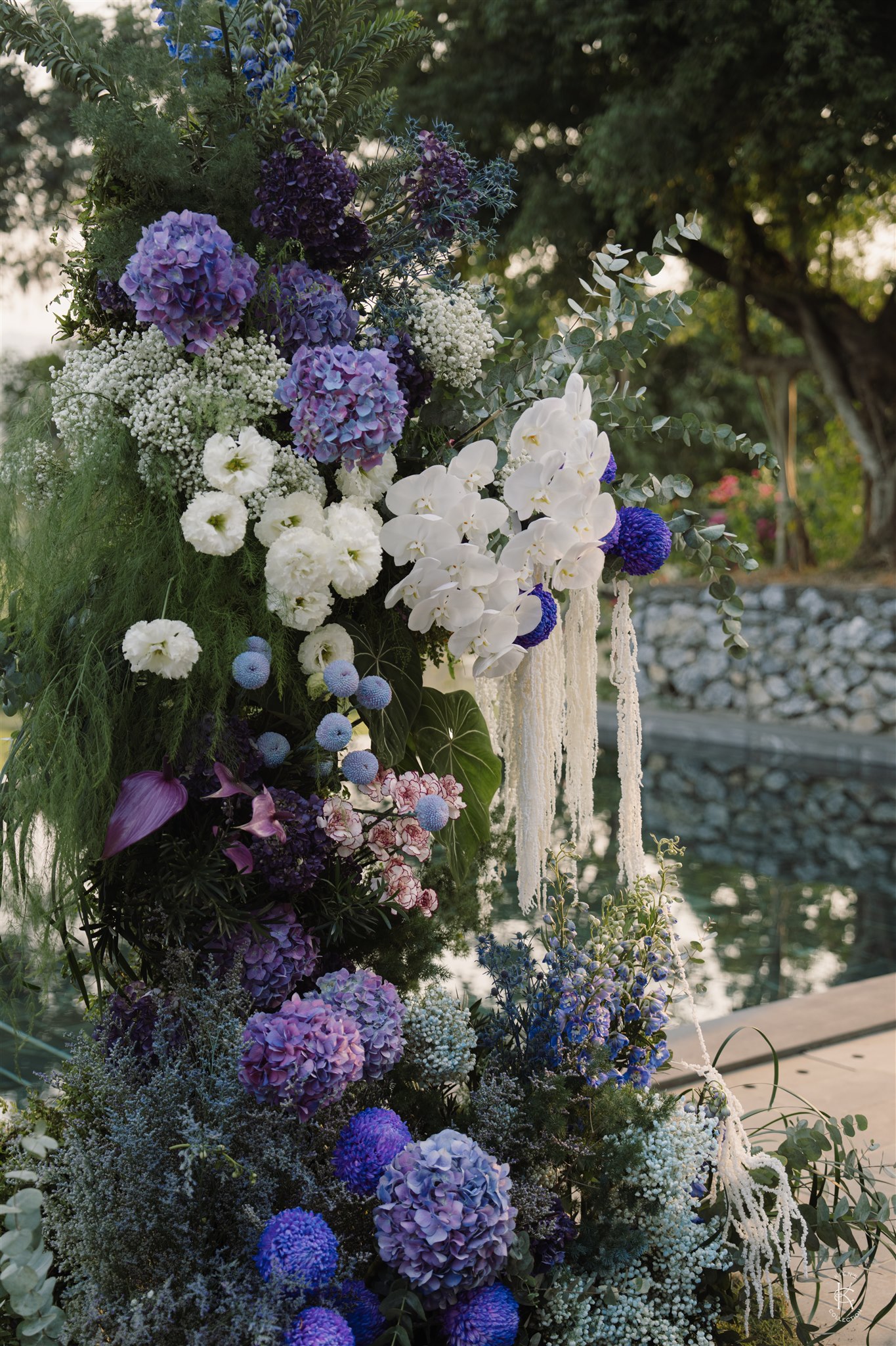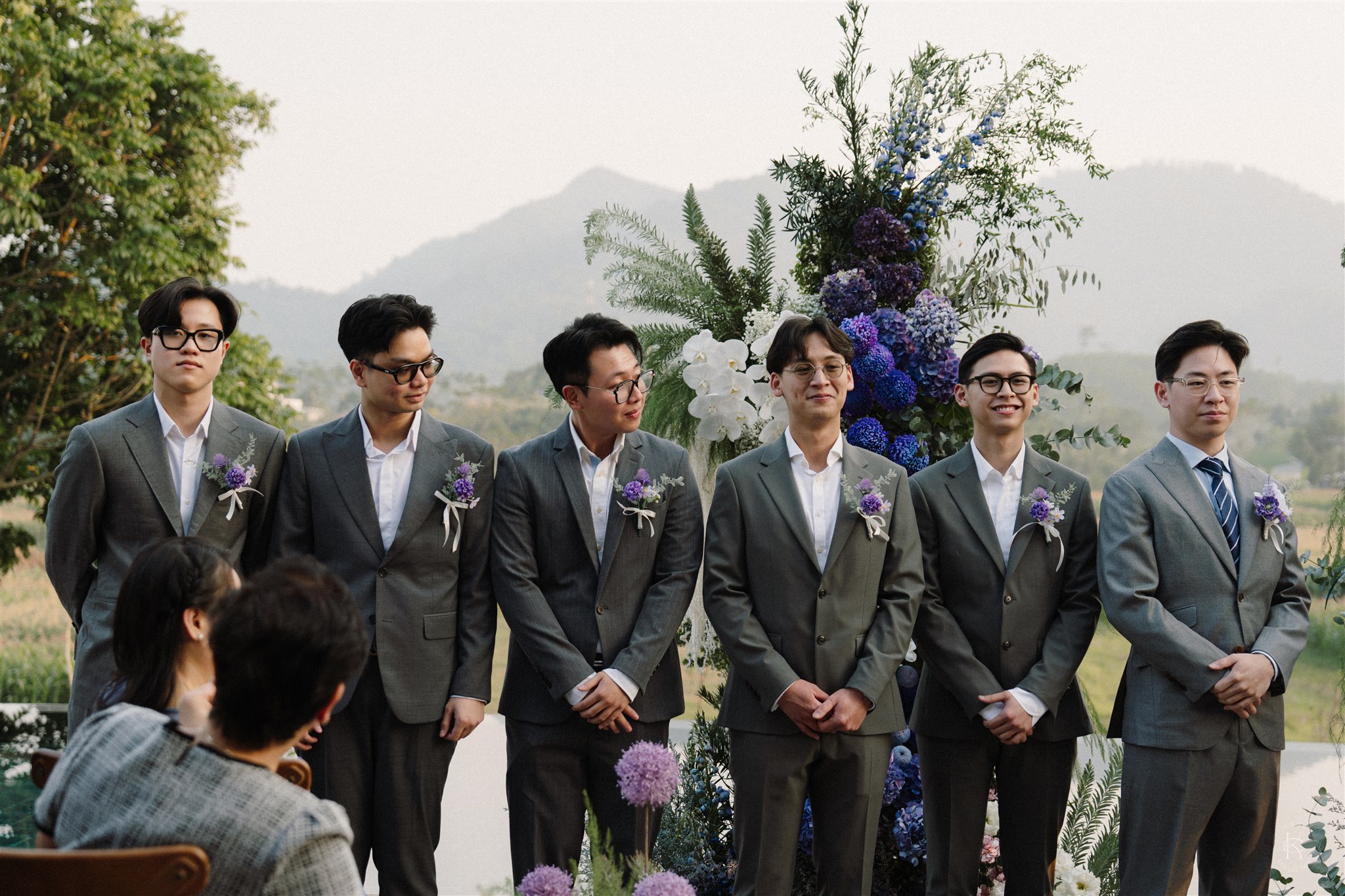 Tone hoa tím – xanh – trắng mang đến một không gian vừa lãng mạn, vừa sang trọng, nổi bật giữa khung cảnh đồng lúa và núi non của Làng Quýt Retreat. Từng cụm cẩm tú cầu, lan hồ điệp, baby trắng và hoa rum được sắp đặt tỉ mỉ, tạo thành những khối hoa mềm mại như dòng chảy ôm trọn lối đi lễ đường. Backdrop đôi hoa lớn đặt đối xứng, hướng thẳng về phía khung cảnh thiên nhiên mở rộng, để mỗi bước chân của cô dâu chú rể như dẫn vào một bức tranh ngoài đời thực. Ánh sáng chiều buông nhẹ trên từng cánh hoa, làm nổi bật chất liệu và màu sắc, khiến không gian vừa nên thơ vừa ấn tượng.