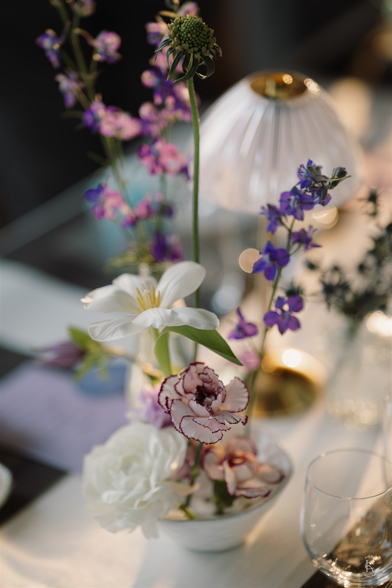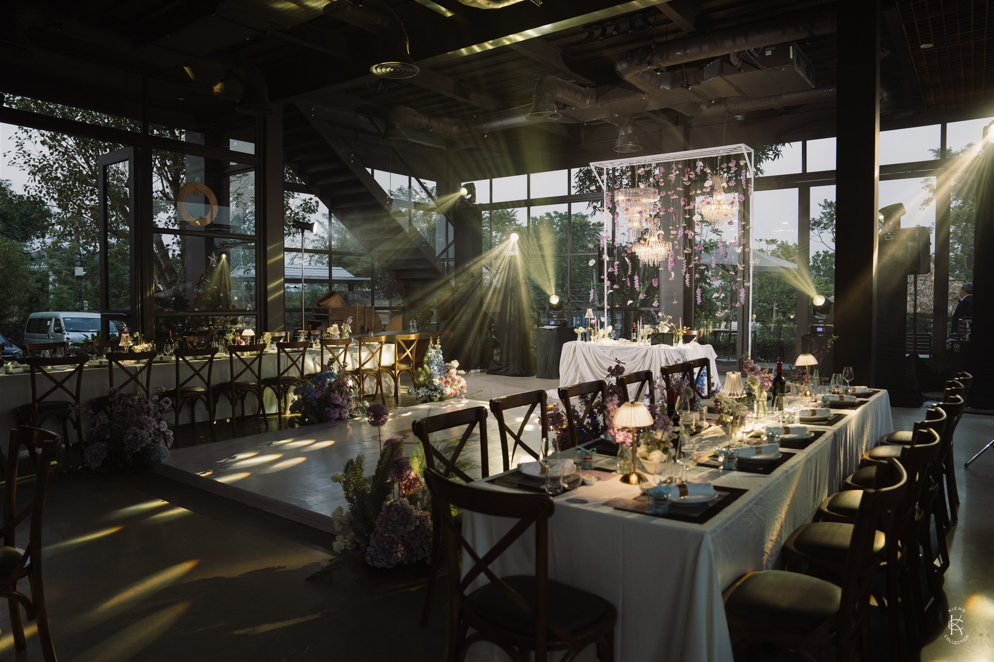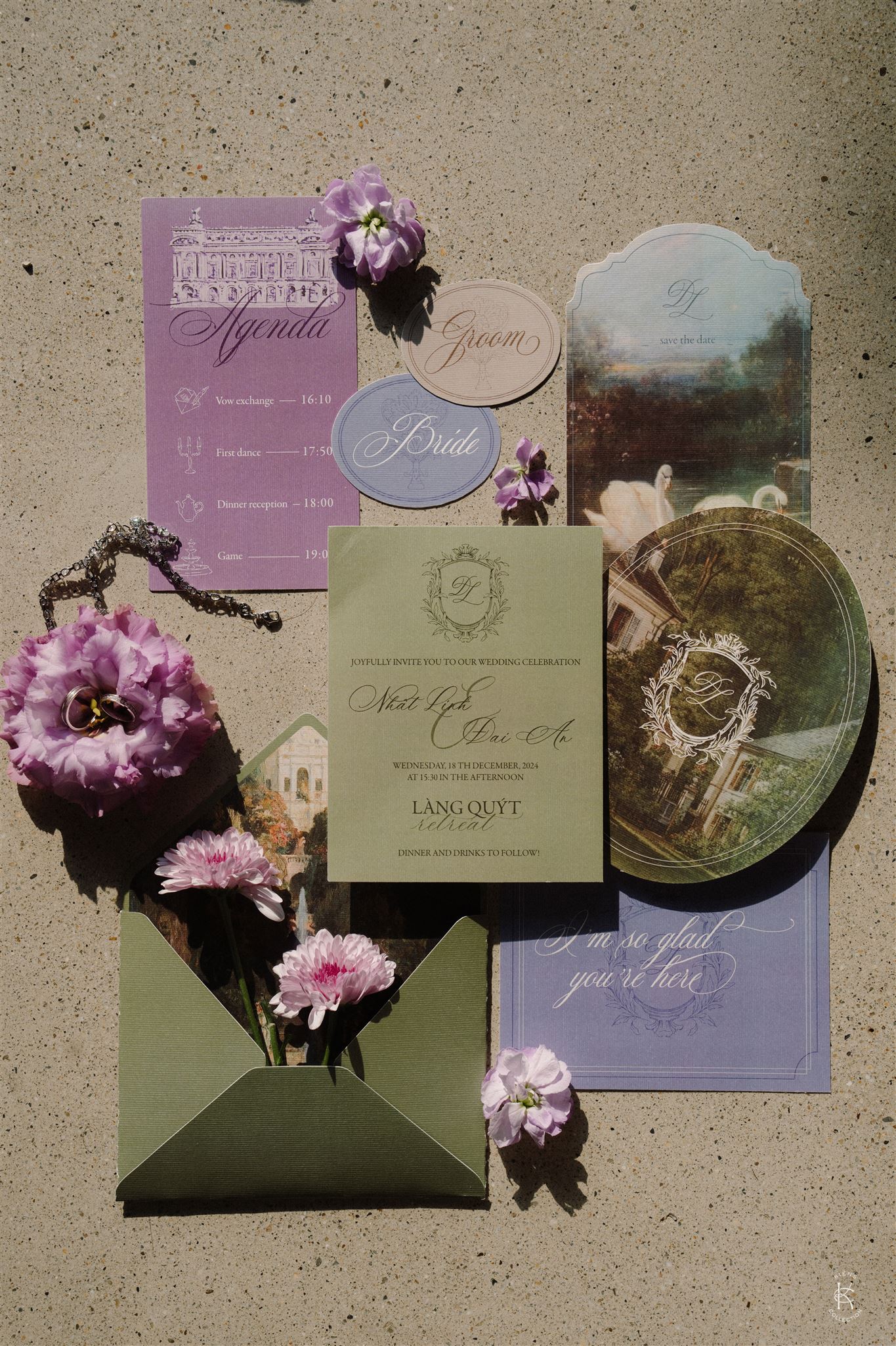 Tone hoa tím – xanh – trắng mang đến một không gian vừa lãng mạn, vừa sang trọng, nổi bật giữa khung cảnh đồng lúa và núi non của Làng Quýt Retreat. Từng cụm cẩm tú cầu, lan hồ điệp, baby trắng và hoa rum được sắp đặt tỉ mỉ, tạo thành những khối hoa mềm mại như dòng chảy ôm trọn lối đi lễ đường. Backdrop đôi hoa lớn đặt đối xứng, hướng thẳng về phía khung cảnh thiên nhiên mở rộng, để mỗi bước chân của cô dâu chú rể như dẫn vào một bức tranh ngoài đời thực. Ánh sáng chiều buông nhẹ trên từng cánh hoa, làm nổi bật chất liệu và màu sắc, khiến không gian vừa nên thơ vừa ấn tượng.